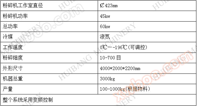 The complete set of low-temperature grinding machine for this product consists of a silo, mechanical crusher, induced draft fan, cyclone, airflow screen (customized by the user), vacuum automatic feeding (customized by the user), liquid nitrogen tank (customized by the user), etc.
